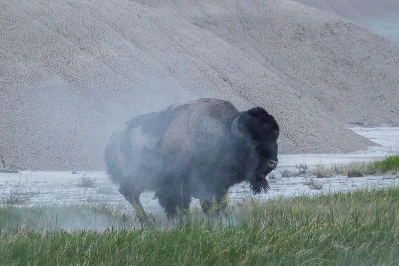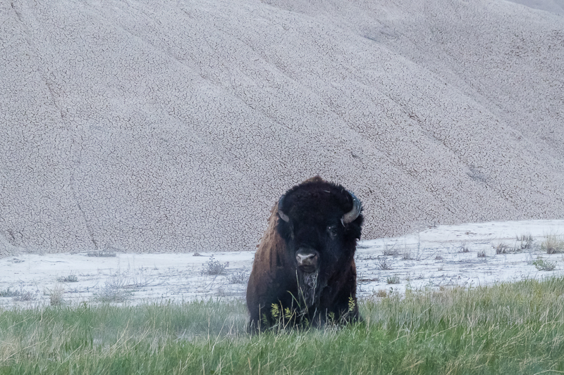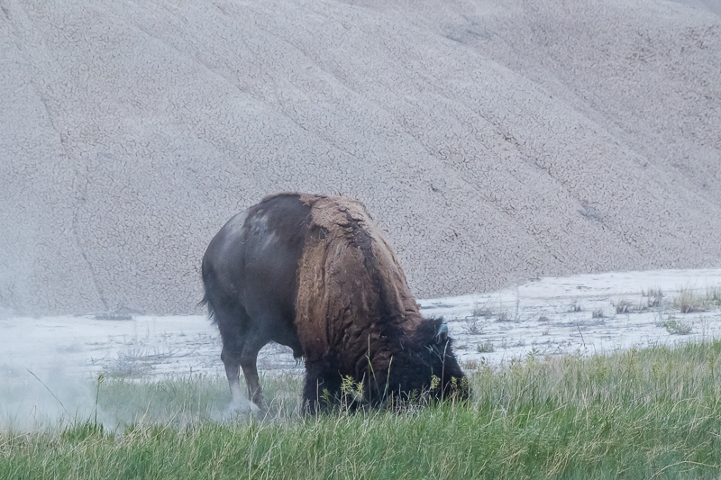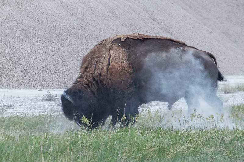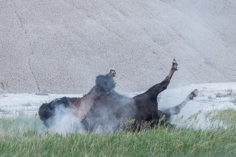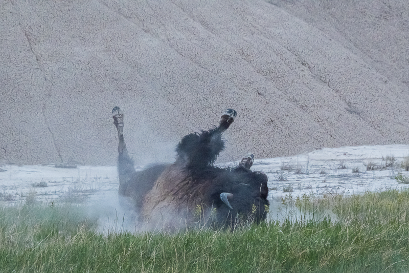 For no particular reason we turned south off Badlands Loop Road onto Conata Road, probably because we did not drive down this road during our previous visit to the park. What a stroke of luck. We came across a bison in a small field who decided to take a dust bath in a dirt patch about twenty yards from our car. We spent more time watching this bison roll around in the dirt than we did at any overlook.
