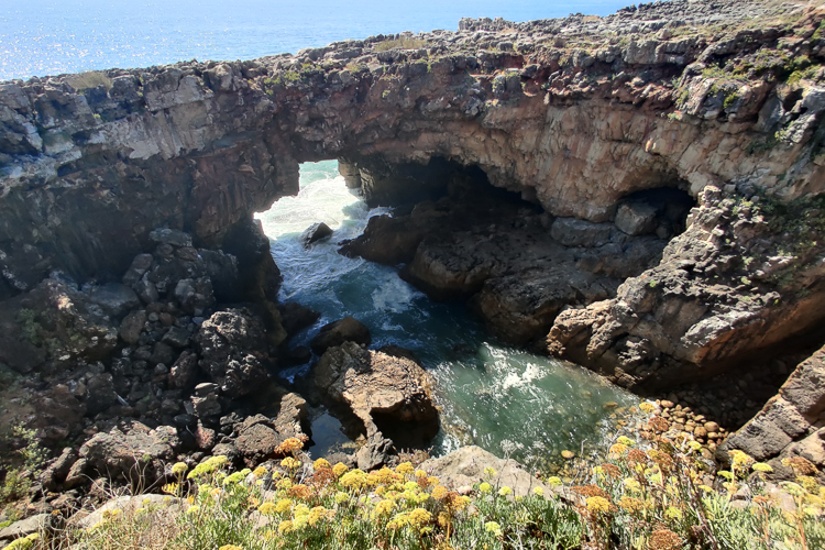 Our journey continued along the coast, walking past the lighthouse and a park until we reached Boca do Inferno (the Devil’s Mouth), a popular ocean viewpoint of a natural arch, surrounded by souvenir stores and cafés. There are nice views of the cliffs from the observation deck, but the best views of the arch are from a spot looking over a short wall behind a tourist store.