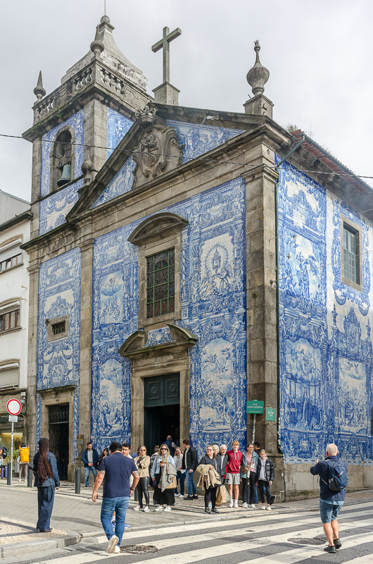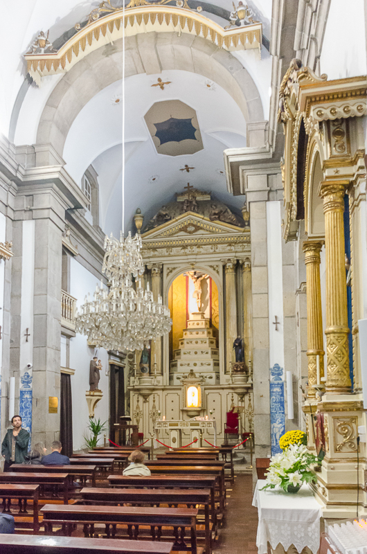 After taking a short cut through the Bolhão metro station, we exited up the escalator across the street from Capela das Almas de Santa Catarina, the Chapel of Souls. This small church is well known for its azulejos tile façade. The odds of it being surrounded by dozens of people and a tour group or two when you show up are pretty good. And expect the sanctuary to be quite crowded.